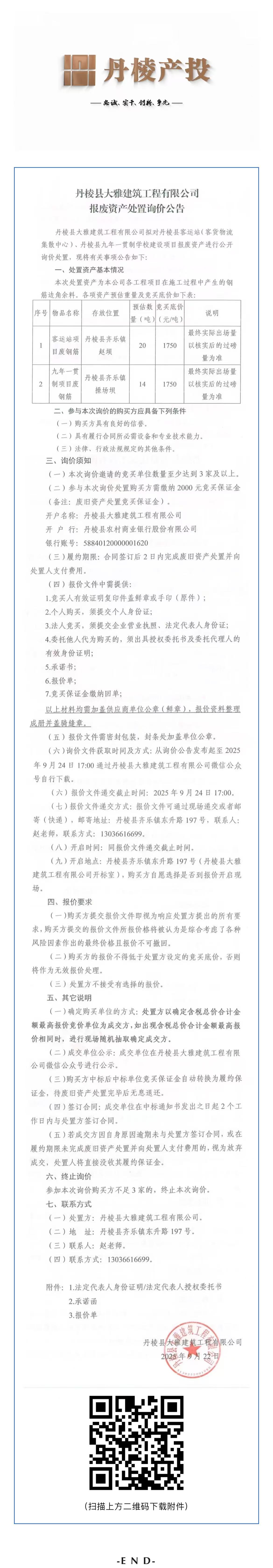 丹棱縣大雅建筑工程有限公司報廢資產處置詢價公告