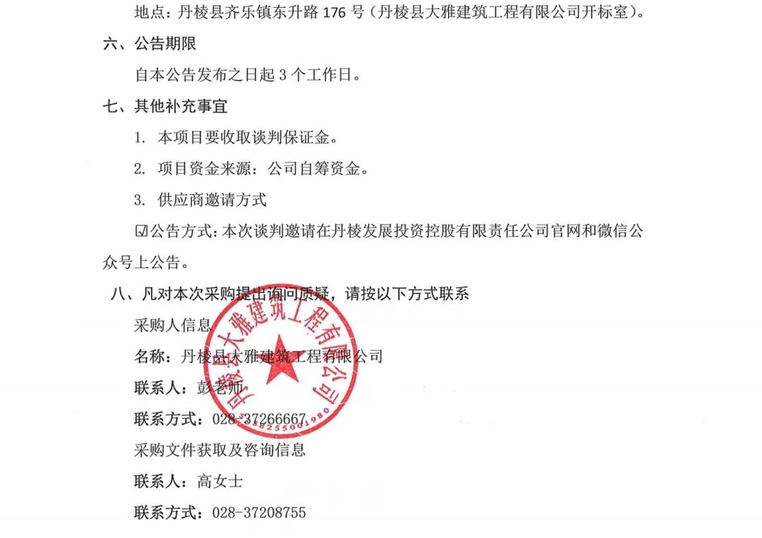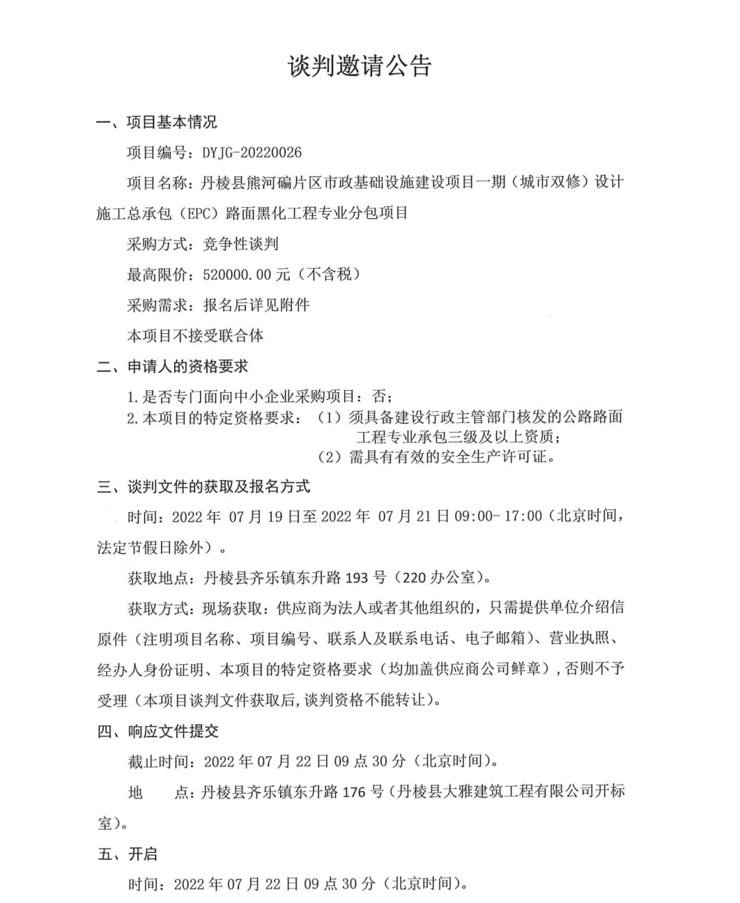 丹棱縣熊河碥片區市政基礎設施建設項目一期(城市雙修)設計施工總承包(EPC)路面黑化工程專業分包項目談判邀請公告
